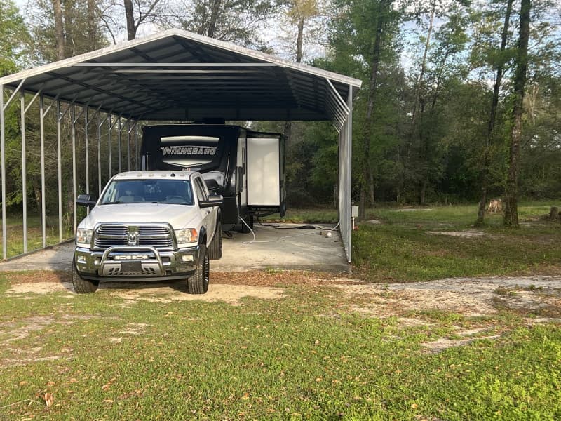 Discover an inviting RV camping haven tucked into a peaceful rural setting. Choose from two covered Full Hookup sites under a roomy carport--available with 50 amp or 30 amp service, water, sewer, WiFi access and trash disposal--plus donation-based boondocking spots off-grid. Level concrete pads, shaded surroundings and dark starry skies set the scene for a serene stopover. Flexible multi-night and long-term stays welcome; pets by arrangement.