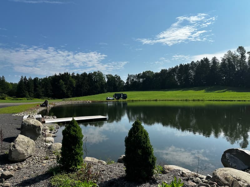 Nestled among golden hayfields, this private pondside retreat offers serene RV Camping by tranquil waters. Two water/electric sites overlook the pond--listen to frogs at night, spot deer at dawn, or fish beside your rig with provided firewood and fire ring. A mile from village shops, Tractor Supply and NAPA, and 20 mins from a safari park. A short walk or drive leads to a casual tavern (Tue–Fri, 11a–8p) serving brisket mac ’n’ cheese, prime rib sandwich, local wines, craft beers and live music. Perfect for peaceful rural getaways.
