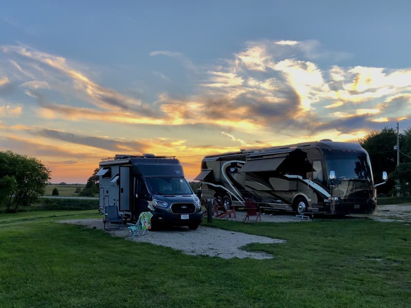 Rev up your RV Camping adventure at this lively entertainment park featuring a ½-mile looping go-kart track, 27-hole mini-putt course and driving range with bucket rentals. Park on level grass with optional electric and water hookups, then recharge at the on-site snack counter offering burgers, fish and chips, milkshakes and ice cream. Pet-friendly grounds and a kids’ playset make this spot a winner for families seeking fun and convenience.
