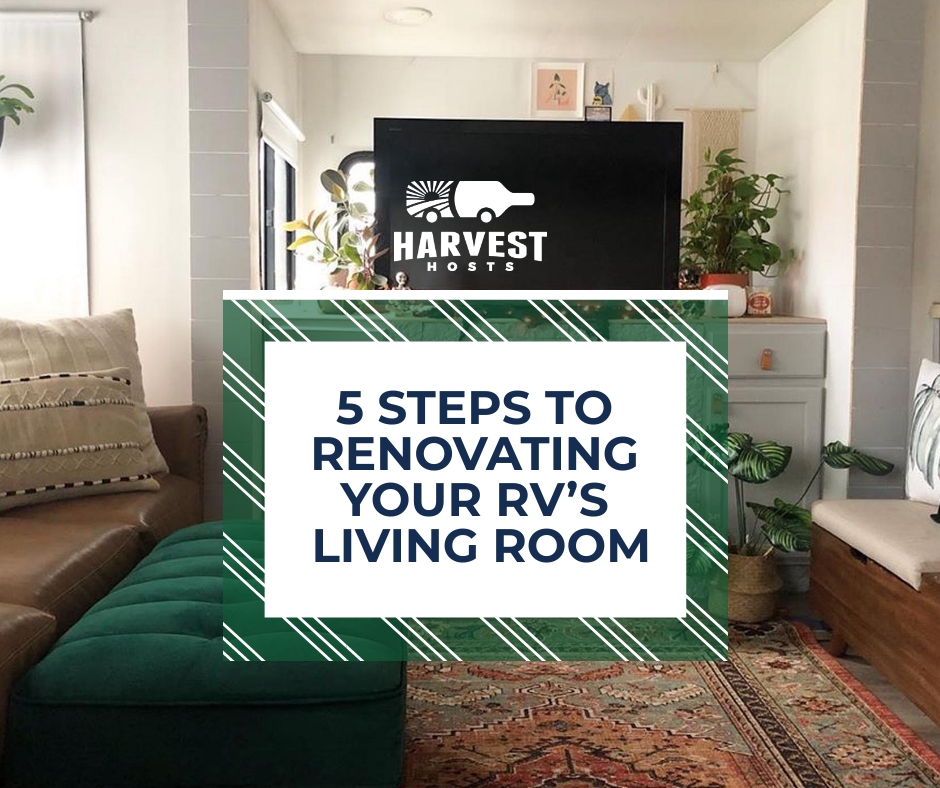 This final step is where you can really show your own personal design style. Adding a few wall hangings can take your space to a whole new level. You can find so many different options on Etsy and other handmade markets, with items such as woven fiber art, hand-drawn watercolor sketches, ceramic tiles, and so much more. After adding wall hangings, you can add a few statement pieces to your coffee table or bookshelf, such as a globe or items found throughout your travels. Plants also add an element of liveliness to a space. Whatever you choose, be sure to keep the theme consistent and minimal. Even a few items can make a big difference in a small space, so remember to keep it simple.Renovating your RV’s living room is a pretty big task, but it will leave you with a space that you are more likely to enjoy throughout your future travels. Imagine curling up with a new book or enjoying a glass of wine as you overlook your next Harvest Hosts location, all from the comforts of your newly-remodeled living room. If this sounds ideal to you, then follow these tips for ideas on designing an easy and beautiful new living room that your whole family can enjoy.