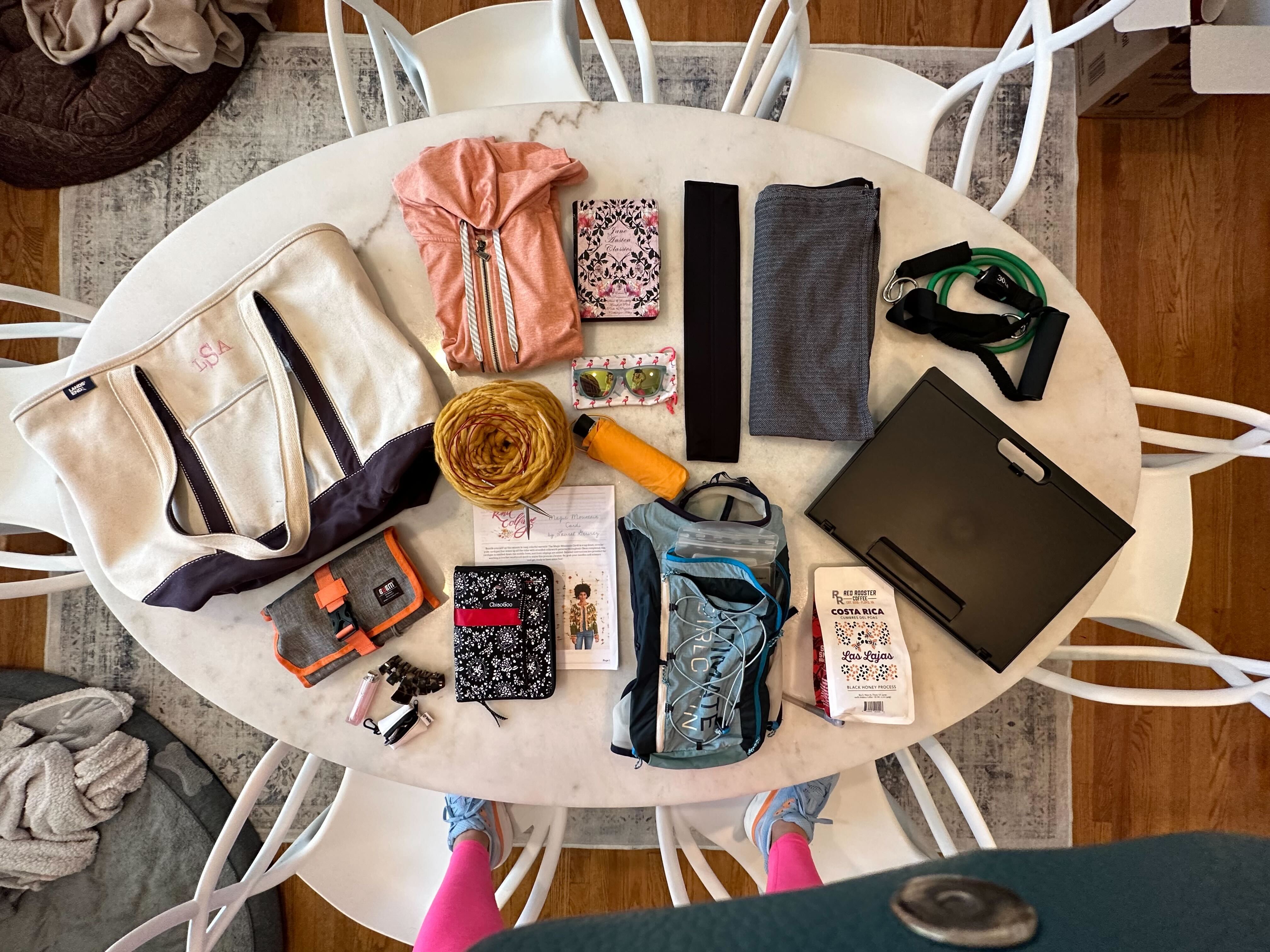 On the road, I work to stay healthy. Exercise bands and yoga/strength training kneepads (not pictured) are my go-tos for packable multi-purpose equipment