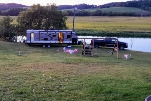 Our family farm offers a delightful getaway with a scenic view. Enjoy camping by the pond in your tent or RV, or find a spot nestled among the trees for a more secluded experience. While you're here, our dogs and kids may keep you company. Feel free to bring your dogs for a swim or explore paddle boating and fishing at our private pond. Although the fish aren't huge, both kids and adults enjoy the activity. End your day with a cozy campfire under the never-ending stars.