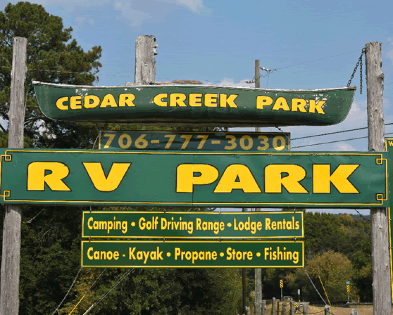 Cedar Creek Park is a Family Friendly Campground with 62 full hookup RV sites, Driving Range, a rental camper, Lodge, 24 tent sites, and a group tent site. We are focused on a good experience for all guests. Picture yourself practicing your golf swing at our driving range, shopping at the antique shops, paddling down the Big Cedar Creek, or fishing out your back door. It is all possible here at Cedar Creek Park, our RV Park in Cave Spring, Georgia. When you stay at our campground near Rome and Cedartown you will have access to all the attractions in northwestern Georgia has to offer, plus activities like fishing, Striper fishing, golfing, boating, Canoeing, Kayaking, hiking, biking, and much more. Join us today and see what Georgia camping near Weiss Lake is all about!