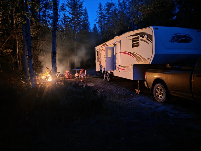 Experience RV camping on a secluded two-acre wooded summit at this off-grid solar homestead. A level concrete pad with full hookup sits beneath towering pines, offering sweeping mountain views and easy access to on-site hiking trails. Nearby paved bike and walking paths lead into town or into a forest conservancy dog-friendly trail. Warm, knowledgeable hosts share eco-living insights and welcome you for fireside chats under starlit skies.