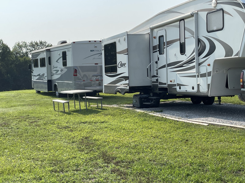 • 2 spots for up to 45' on gravel with two 30amp hookups for $15 each.