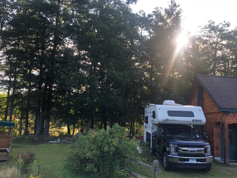 Experience RV Camping at a tranquil rural retreat framed by a small Corps-managed pond and forest. A level gravel pad backs onto tall pines and opens to a 10-acre field, perfect for sunset views or evening campfires with your hosts and their friendly pup. Borrow kayaks for morning paddles, hike nearby trails and Mt. Monadnock, or explore historic mill villages and local dining. Quiet, welcoming, and ideally located for nature lovers.