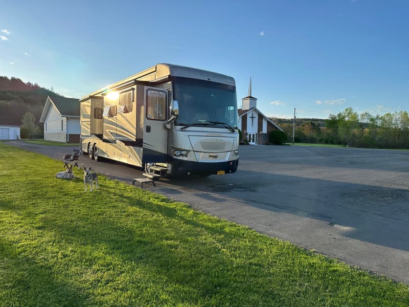 Nestled amid meadows and forested hills, this peaceful community church offers secure, level parking spaces perfect for RV Camping. Wide, flat spots feature easy in/out access and serene mountain views. Friendly hosts ensure prompt communication, clear directions and a warm welcome. Enjoy the quiet surroundings--early risers might spot deer grazing at dawn. Donations are welcomed online for those who wish to support the community.