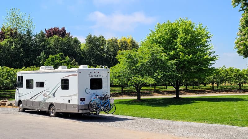 Nestled along a scenic river bike path, this family-run fruit farm invites RV Camping amid apple orchards and seasonal U-pick fields. The on-site country market stocks local produce, jams, simple syrups and baked-from-scratch pies, tarts and muffins. Park easily on level ground steps from the riverfront trail, with quick access to nearby vineyards, charming historic Old Town shops and biking routes.