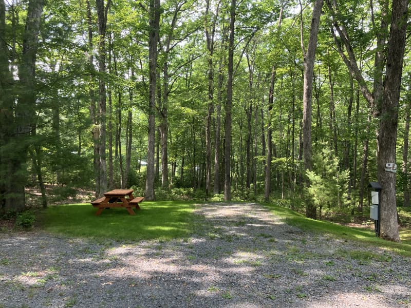 Nestled in a tranquil, wooded wetland setting just off the highway, this private site offers water hookup and 20/30-amp electric with a level gravel pad for dry RV Camping. Evenings quiet down as the surrounding forest and wetlands come alive, while nearby small towns, rivers, lakes and Poconos hiking trails beckon adventure seekers. Enjoy a picnic table, dog-friendly grassy spots and easy access to outdoors recreation.