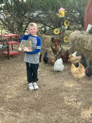 Our 7-year-old loves showing guests the playground equipment, trampoline, swings, garden, feeding chickens, and petting the horses so we are a perfect stop to families. We grow seasonal vegetables and are happy to share them, along with eggs and sand plum jelly, when available. Our two college-aged boys are away at school but may stop by from time to time.