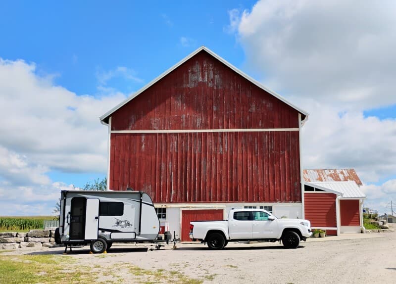 We are a farm so no real RV pads, park in our driveway if you want water and power for 40.00/Day or park in our field for self contained camping.