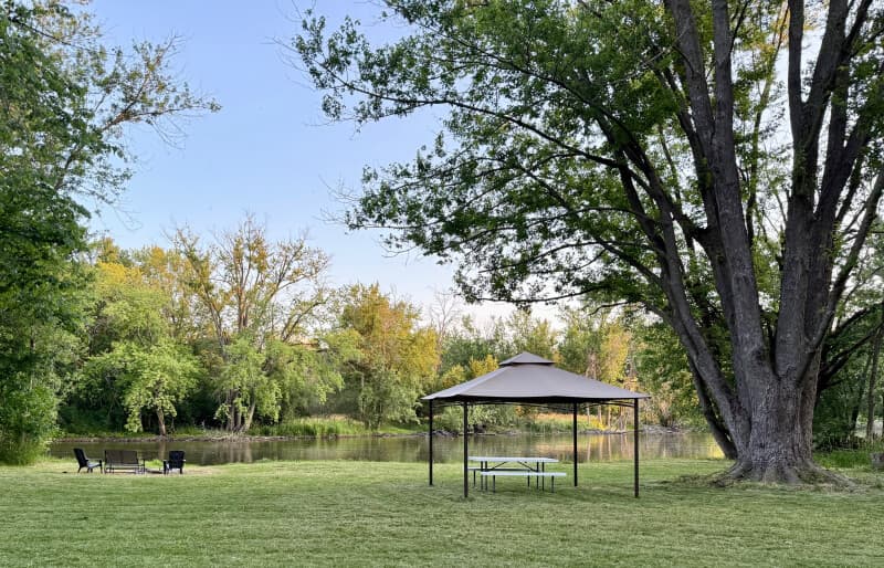 Experience RV camping on a private, wooded lot overlooking a gentle river bend. Gather around the fire pit or picnic under the gazebo before launching a canoe or kayak for a 3–4 mile paddling adventure, complete with convenient pickup service at the downstream landing. Cast a line from shore for bass and catfish, or explore nearby interurban bike and walking trails. Ideal for a tranquil riverside getaway.
